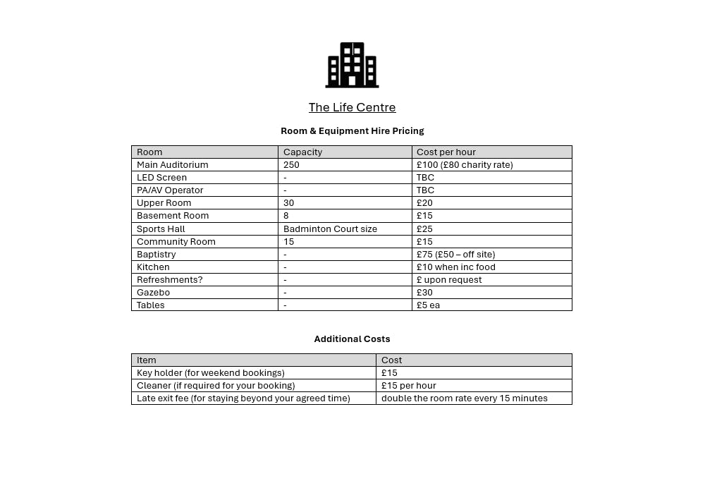 The Life Centre is a large building situated in the centre of Northampton, close to the Bus Station and the Mayorhold Car Park. It has a variety of rooms ranging from office spaces to the main auditorium, many of which are available for hire. In addition to these rooms, it also boasts a recording studio and a Sports Hall.
